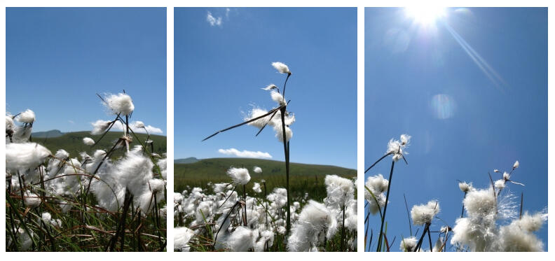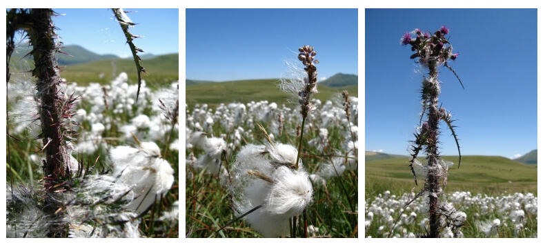 Linaigrette means "cottongrass", one of my favorite plants. From Auvergne to Scandinavia, it grows in fragile and magic places I feel particularly related and attracted to. I love its fluffy hair that waves and shines like snow in the summer sun, that feels as soft as silk, and looks as bright as paper fibers...As with every plant in this world, each part of it is of interest for many species : when winter is over the young shoots are eaten by animals such as reindeer, birds eat their seeds too. Young shoots are also eaten by some people, and flowers can be infused in sun teas. The cottony seedheads were also used as stuffing for pillows, mattresses...As for its brown fibers that have soaked for at least a century in peat bogs, they have gained incredible properties : extremely resistant, antistatic, antibacterial, microporous and insulating, they can be spun and mixed with other fibers such as wool, to create an almost fireproof textile.